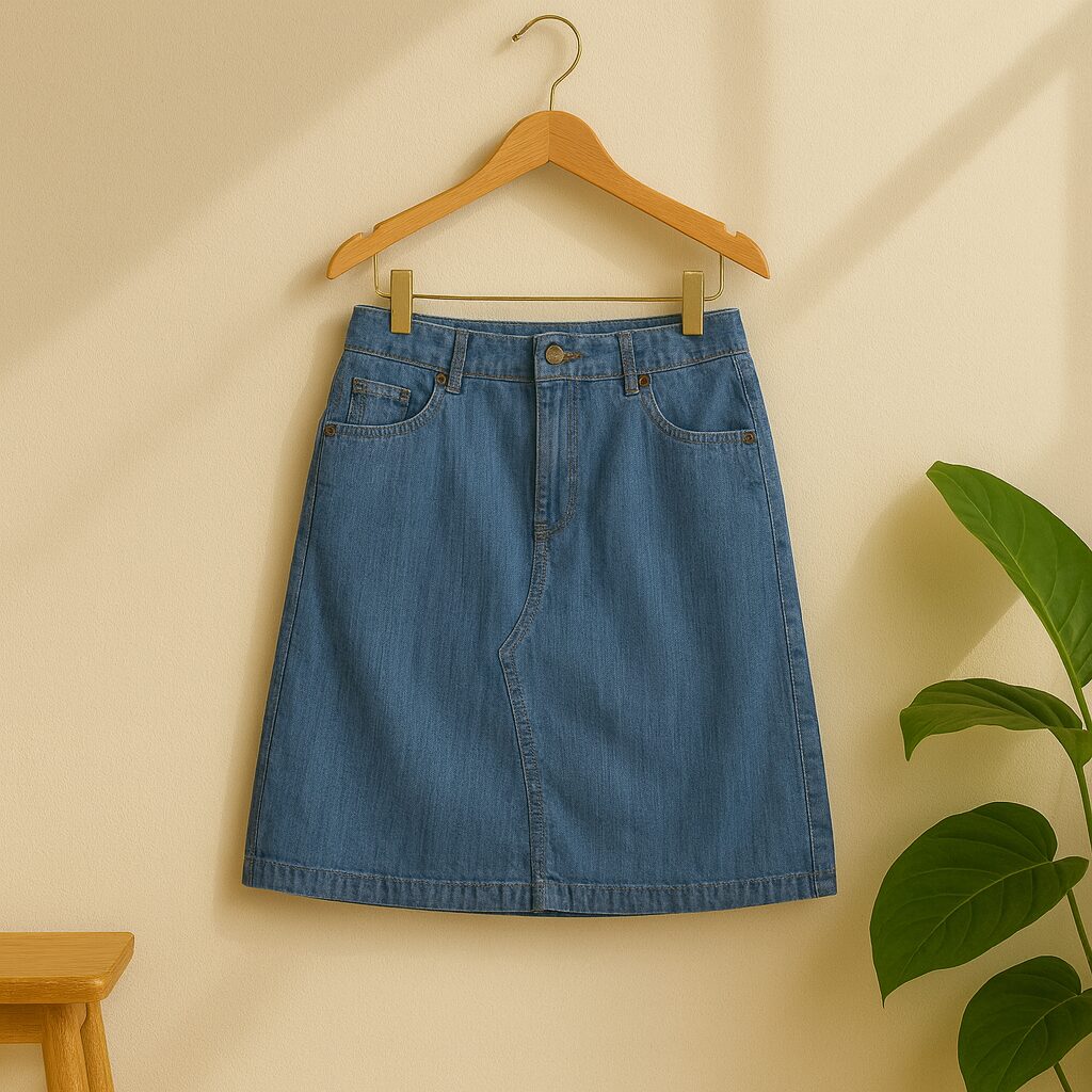 Pollera de jean azul con bolsillos y cierre delantero. Versátil, cómoda y perfecta para todos los días.